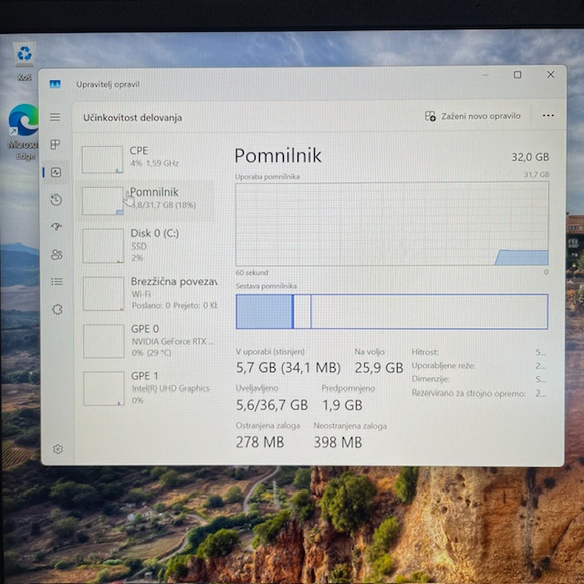 Če vaš računalnik pogosto deluje počasi, se zatika pri odpiranju programov ali ima zakasnitve pri večopravilnosti, je to lahko znak, da ima premalo RAM-a. Posebej opazno je to pri namiznih računalnikih ali PC-jih, ki se uporabljajo za zahtevnejše naloge, kot so igre, obdelava videa ali delo z več zavihki hkrati. RAM lahko preverite v upravitelju opravil (Task Manager) pod zavihkom »Performance«. Če je pomnilnik pogosto zaseden nad 80–90 %, razmislite o nadgradnji. Pri namiznem računalniku je nadgradnja RAM-a običajno enostavna in cenovno ugodna rešitev.